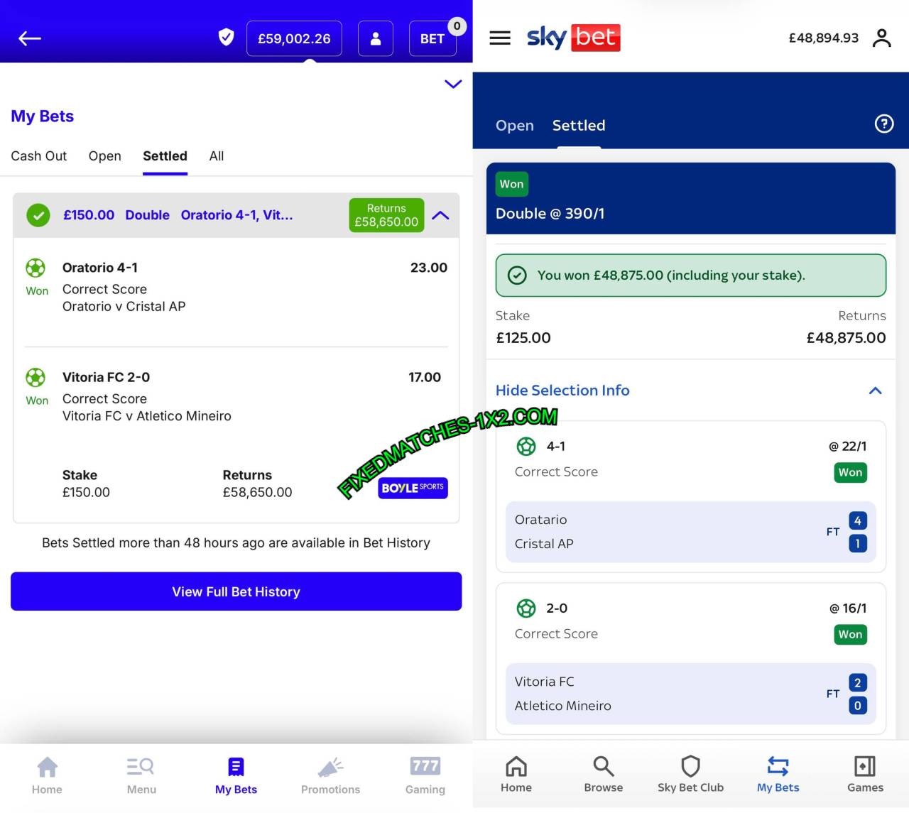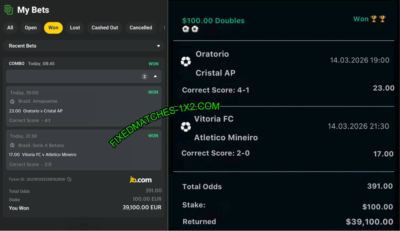 | Vitoria vs Atletico-MG | 2:1 (CS) | 17.00 | FT: 2:1 WIN |